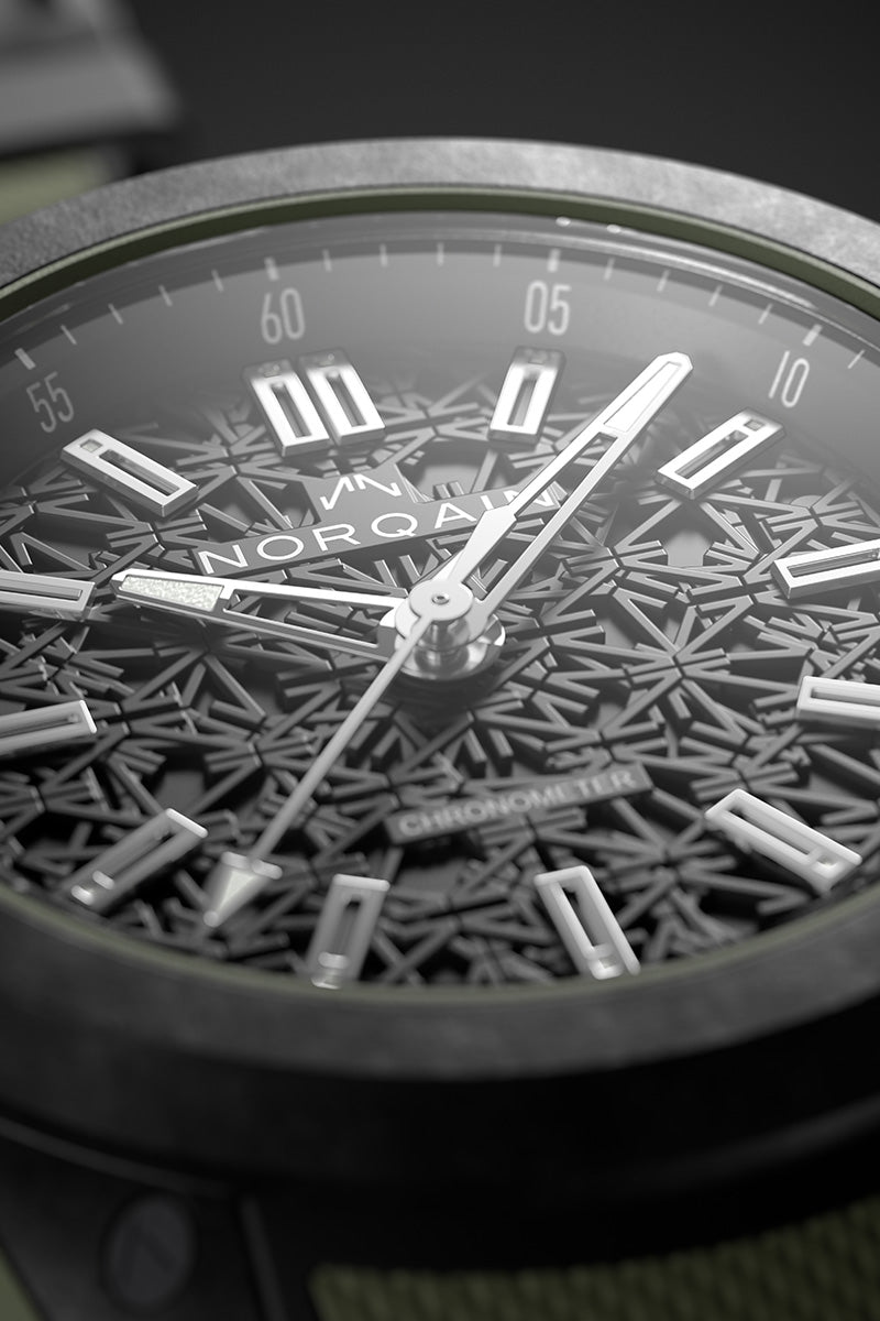 Die Wild ONE aus unserem ultra-robusten und ultra-leichten patentierten NORTEQ® Karbonfasermaterial ist die ultimative Hochleistungssportuhr. Sechsmal leichter als Stahl und 3.5-mal leichter als Titan wurde die Wild ONE in Zusammenarbeit mit Jean-Claude Biver, dem NORQAIN-Team und den besten Schweizer Lieferanten entwickelt.