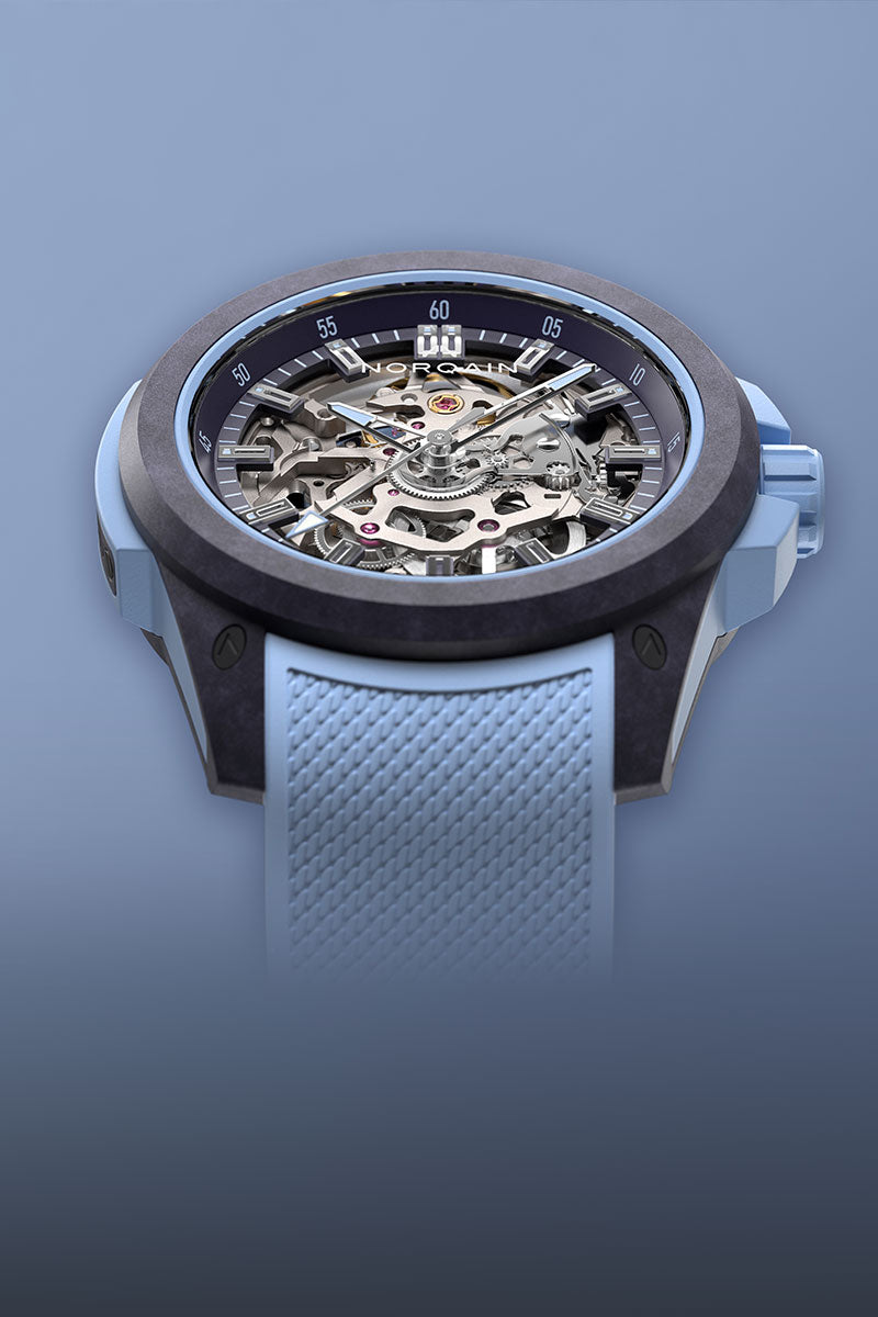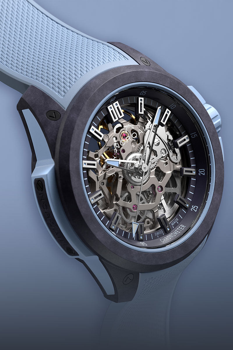 Die Wild ONE aus unserem ultra-robusten und ultra-leichten patentierten NORTEQ® Karbonfasermaterial ist die ultimative Hochleistungssportuhr. Ihr mechanisches, skelettiertes Automatikwerk gibt den Blick frei auf die meisterhafte Handwerkskunst und präzise Technik, die in ihr steckt.