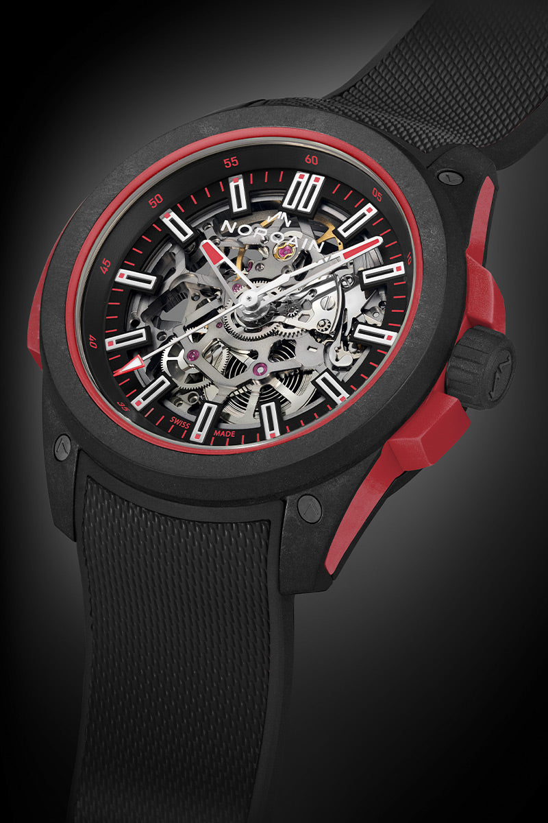 La NORQAIN Independence Wild ONE est la montre de sport par excellence. Elle a été spécialement conçue avec notre matériau exclusif à base de fibre de carbone NORTEQ®, ultra-léger et ultra-résistant. Six fois plus léger que l'acier et 3.5 fois que le titane, cette Wild ONE a été imaginée en collaboration avec Jean-Claude Biver, l'équipe NORQAIN et les meilleurs fournisseurs suisses.