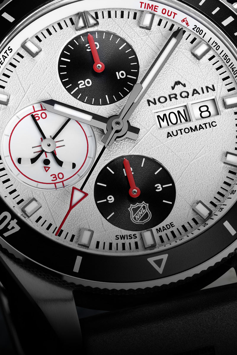 L’Adventure Chrono NHL Limited Edition capture l’énergie, la vitesse et la précision du hockey sur glace. Créée pour célébrer le partenariat de NORQAIN avec la Ligue Nationale de Hockey (NHL), cette édition limitée associe l’intensité du jeu au savoir-faire de l’horlogerie suisse. Des détails inspirés de l’univers du hockey, à la fois subtils et ludiques, rendent hommage à ce sport exigeant, où précision, résistance et maîtrise du temps sont essentielles, sur la glace comme en dehors.