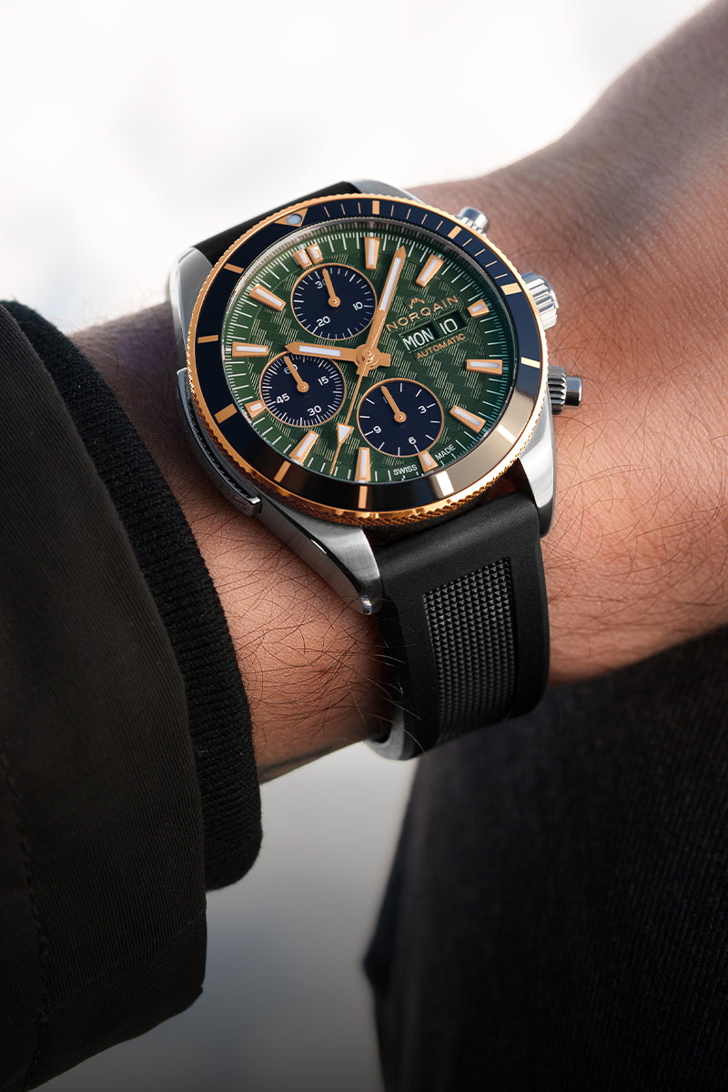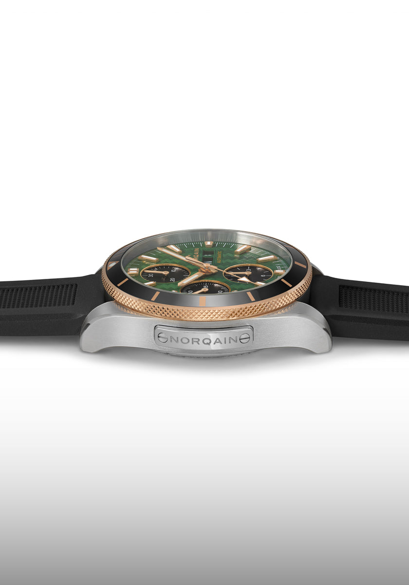 Descrizione generale: La linea Adventure incarna l'emozione di esplorare e conquistare la natura: i sentieri, le vette ed il mare. L'esclusivo motivo NORQAIN si ispira alle montagne svizzere. Questo orologio è limitato a 100 pezzi.