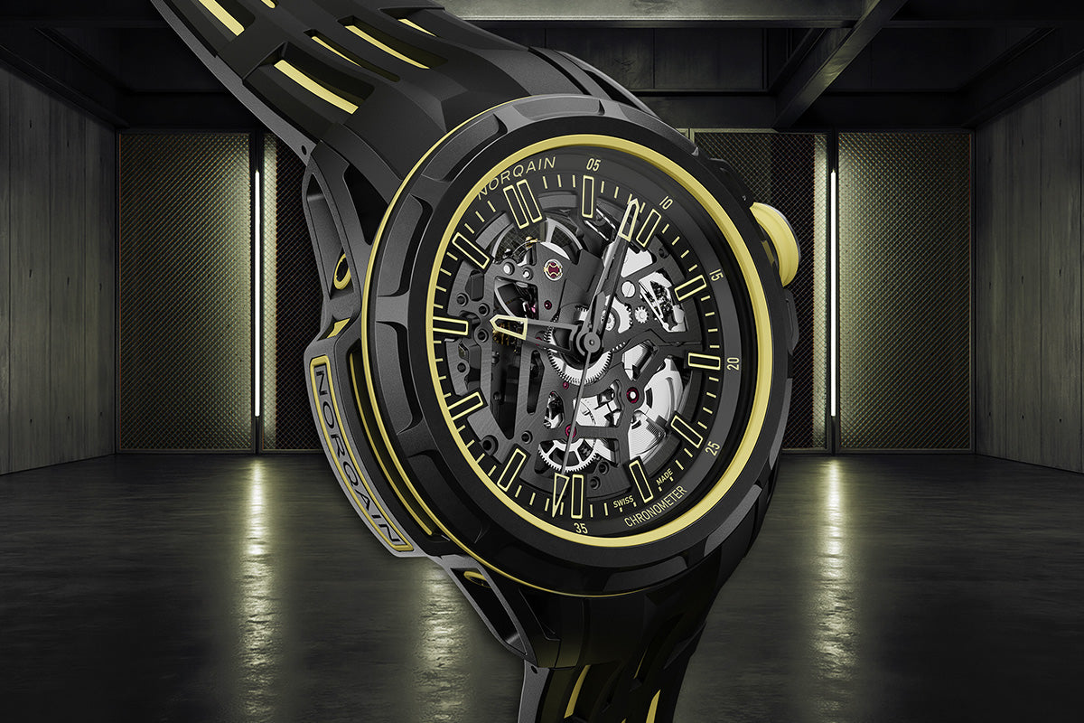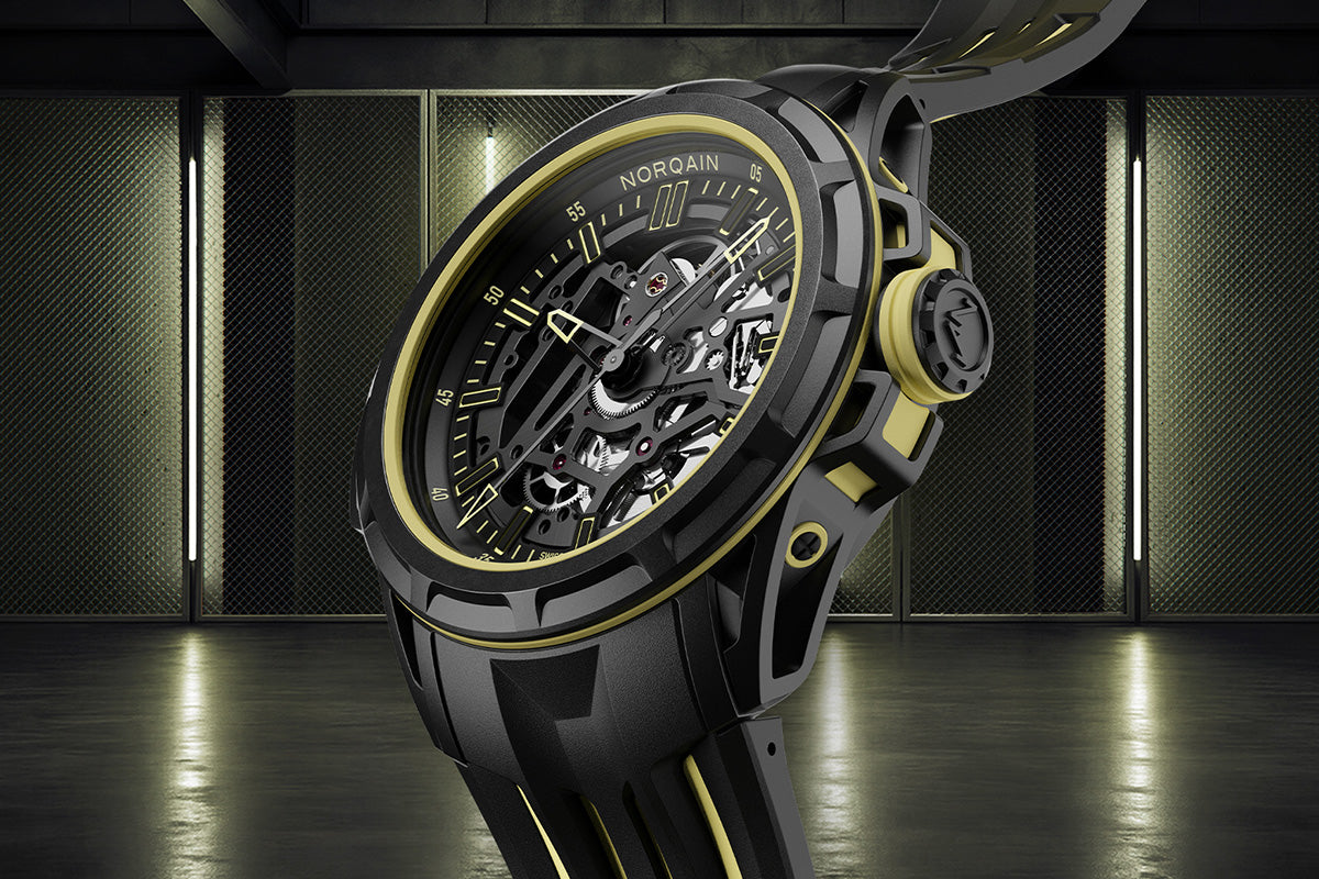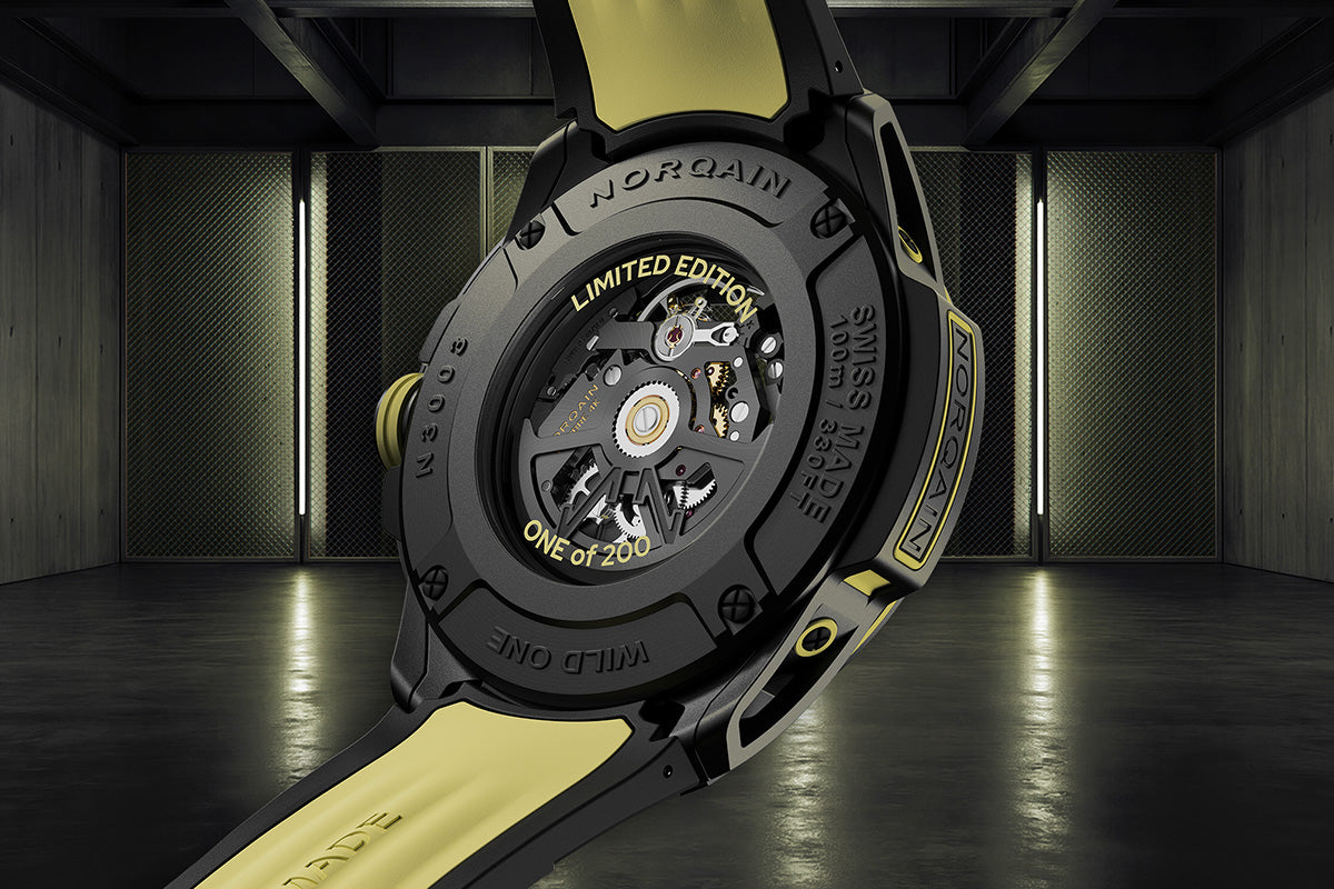 Weighing just 45 grams, the disruptive Wild ONE Skeleton X-Lite becomes the brand’s lightest ever watch. To this feathery weight, NORQAIN developed more than 30 components in ultra-light materials, including titanium, aluminium, NORTEQ® carbon fibre, yellow rubber and an exciting new proprietary carbon fibre composite called X-Lite.