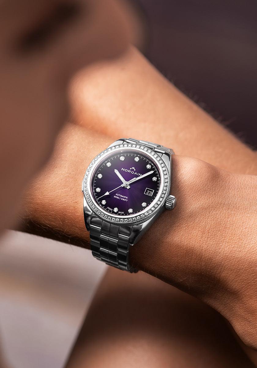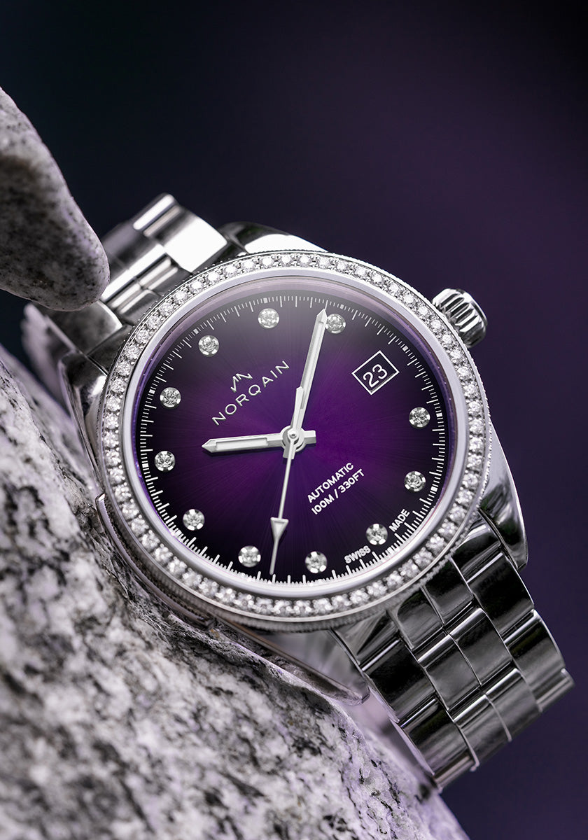 The Adventure Sport 37mm Purple Gradient picks up on a much-loved collection, adding a purple gradient dial with a sparkling sunray finish, a bezel set with 60 diamonds and 11 diamond-set hour markers to give the watch some extra day-to-night razzle.