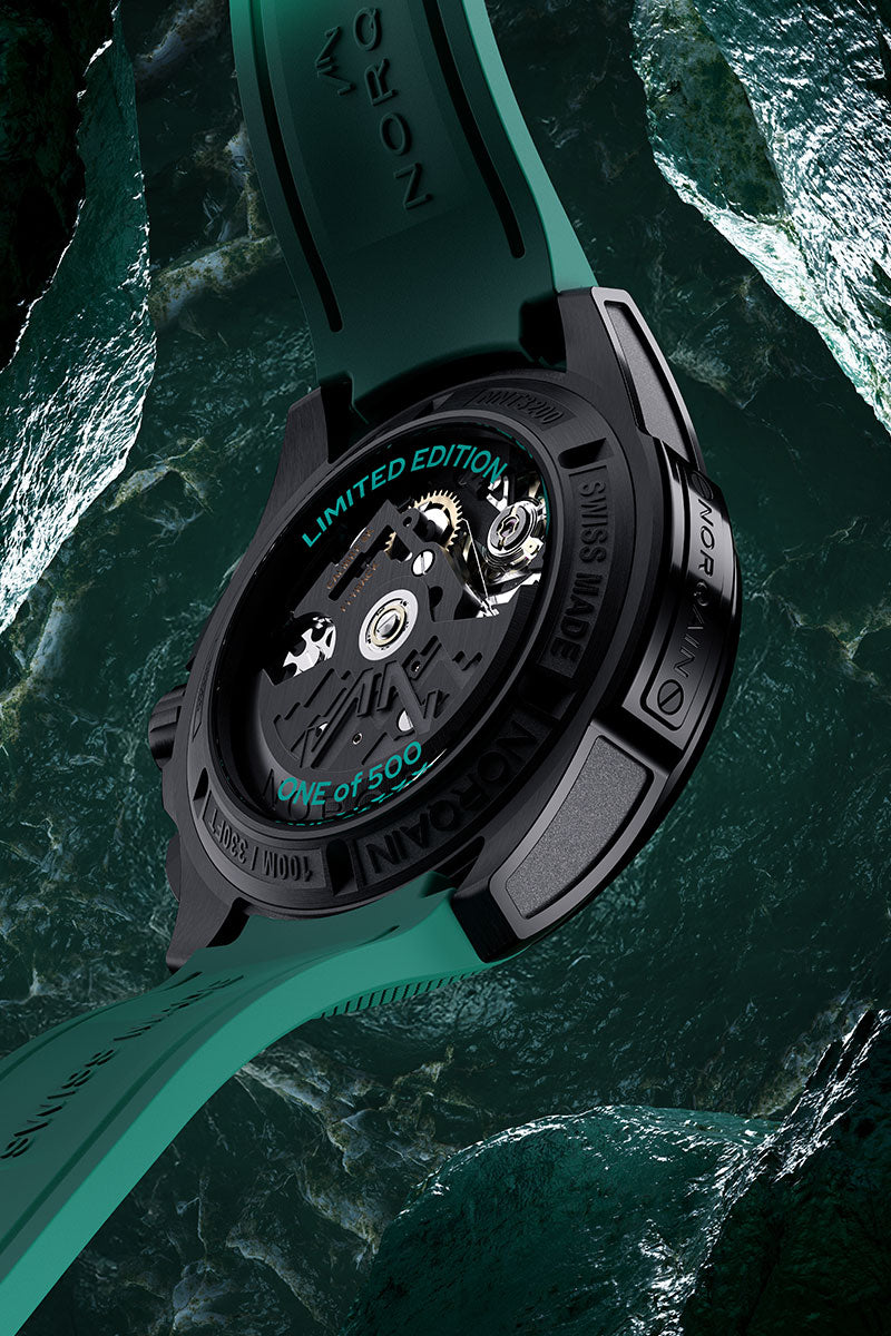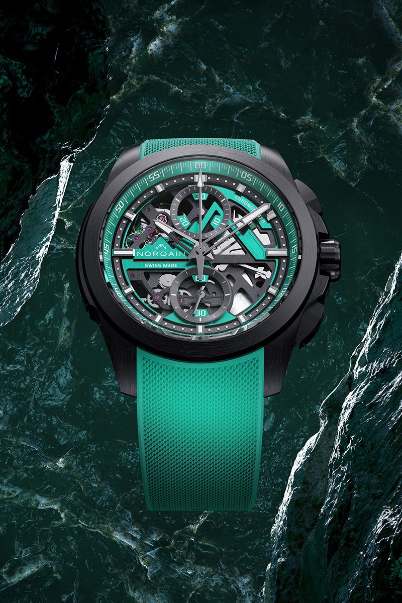 The Independence Skeleton Chrono is powered by the NORQAIN 8K Manufacture Calibre, an exclusive high-performance skeletonised flyback chronograph movement inspired by the world’s highest mountains. This timepiece is limited to only 500 pieces.