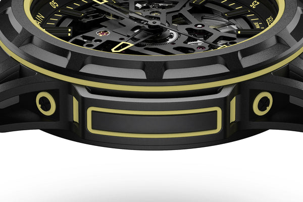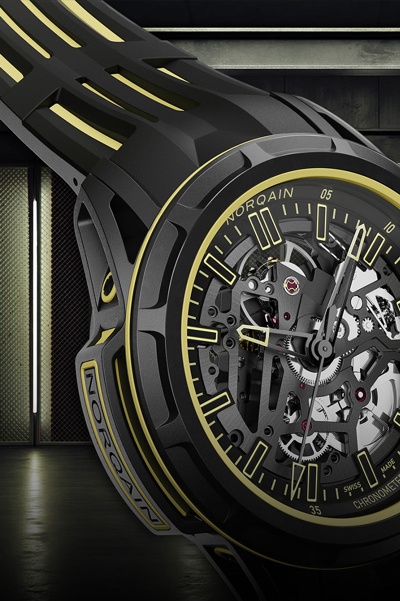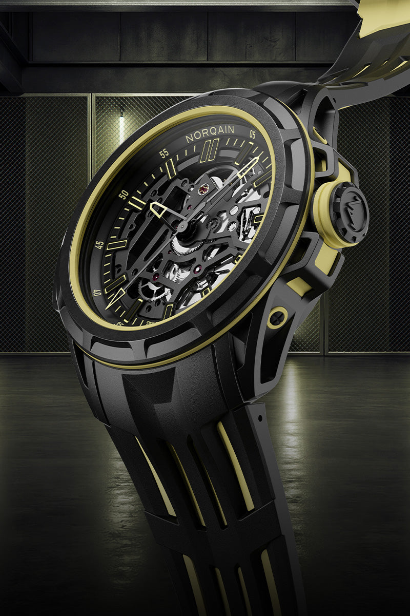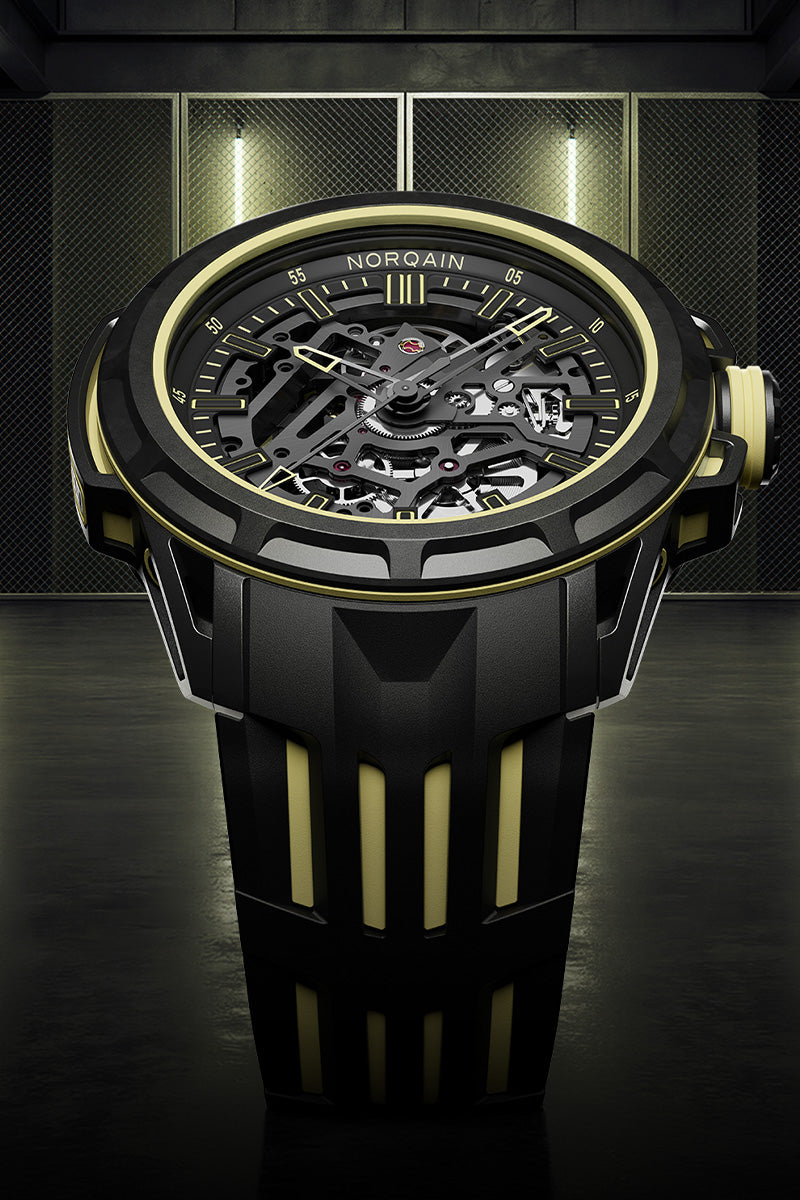 The Wild ONE Skeleton X-Lite is a concept watch limited to 200 pieces, showcasing a new innovative multi-material construction designed for extreme performance. Its complex case architecture, composed of more than 30 components, integrates a highly shock-absorbing X-Lite casing ring and a high-performance mix of NORTEQ®, titanium and aluminum. Weighing just 45 grammes and paired with an ultra-light double-layered rubber strap, it delivers exceptional durability, comfort and resistance while maintaining remarkable lightness.